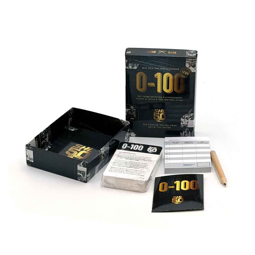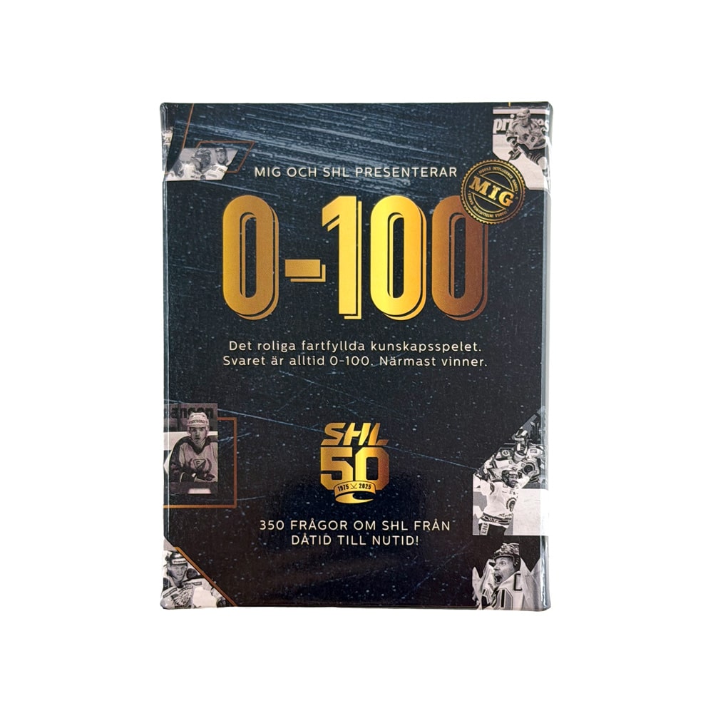 SLUTSÅLD! Se länk nedan för intresseanmälan. Det roliga fartfyllda kunskapsspelet. Svaret är alltid 0-100. Närmast vinner. Nu i specialversion för SHL 50 år, med 350 frågor om SHL från dåtid till nutid!